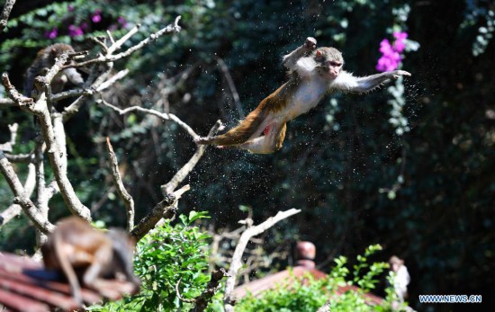 A macaque jumps into water at Nanwan Monkey Islet in Lingshui County, south China's Hainan Province, April 4, 2021. Nanwan Monkey Islet is a nature reserve with over 2500 macaques living here. (Xinhua/Guo Cheng)