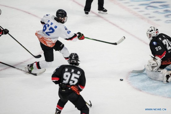 Players compete during an ice hockey test program at the Wukesong Sports Center in Beijing, April 4, 2021. A 10-day ice sports test program for the 2022 Olympic and Paralympic Winter Games is held from April 1 to 10, 2021. This test program is to give a test to competition organization, venue operation, and services and safeguarding. It will engage all ice sports of Beijing 2022, namely short track speed skating, speed skating, figure skating, ice hockey, curling, para ice hockey and wheelchair curling. (Xinhua/Peng Ziyang)