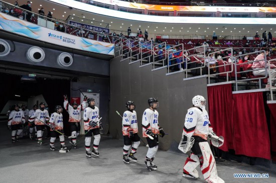 Players enter the rink before an ice hockey test program at the Wukesong Sports Center in Beijing, April 4, 2021. More than one thousand spectators were invited to watch the match to stress test the venue operation. A 10-day ice sports test program for the 2022 Olympic and Paralympic Winter Games is held from April 1 to 10, 2021. This test program is to give a test to competition organization, venue operation, and services and safeguarding. It will engage all ice sports of Beijing 2022, namely short track speed skating, speed skating, figure skating, ice hockey, curling, para ice hockey and wheelchair curling. (Xinhua/Peng Ziyang)