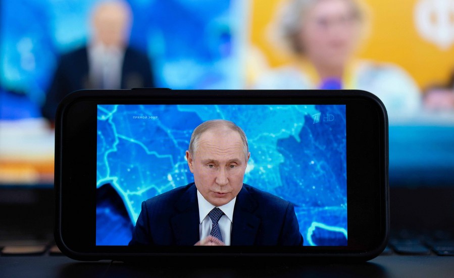 Photo taken on Dec. 17, 2020 in Moscow, Russia shows the live broadcast of Russian President Vladimir Putin speaking during his annual press conference. (Xinhua/Bai Xueqi)