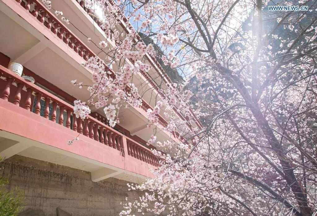 Photo taken on April 4, 2021 shows the scenery of Wengjia Temple in Zhage Village of Taiyanggu Town in Derong County, southwest China's Sichuan Province. Peach blossoms are in full bloom in Derong County. In recent years, the local government has taken advantage of the natural resources to develop rural tourism and helped increase villagers' income. (Xinhua/Jiang Hongjing)