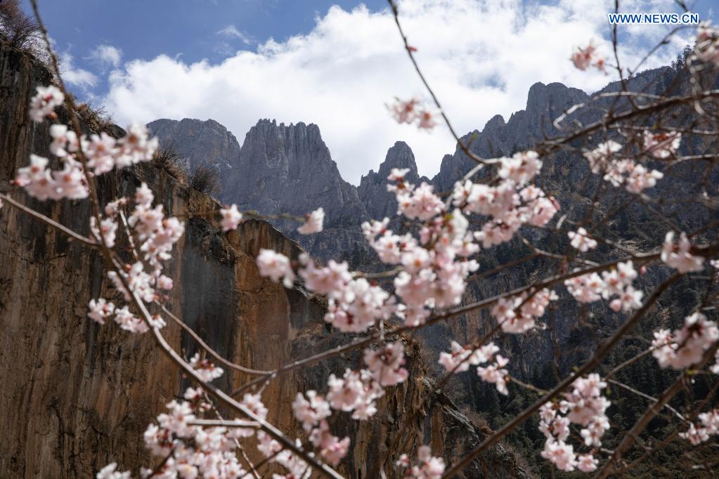 Photo taken on April 4, 2021 shows the scenery of mountains in Zhage Village of Taiyanggu Town in Derong County, southwest China's Sichuan Province. Peach blossoms are in full bloom in Derong County. In recent years, the local government has taken advantage of the natural resources to develop rural tourism and helped increase villagers' income. (Xinhua/Jiang Hongjing)