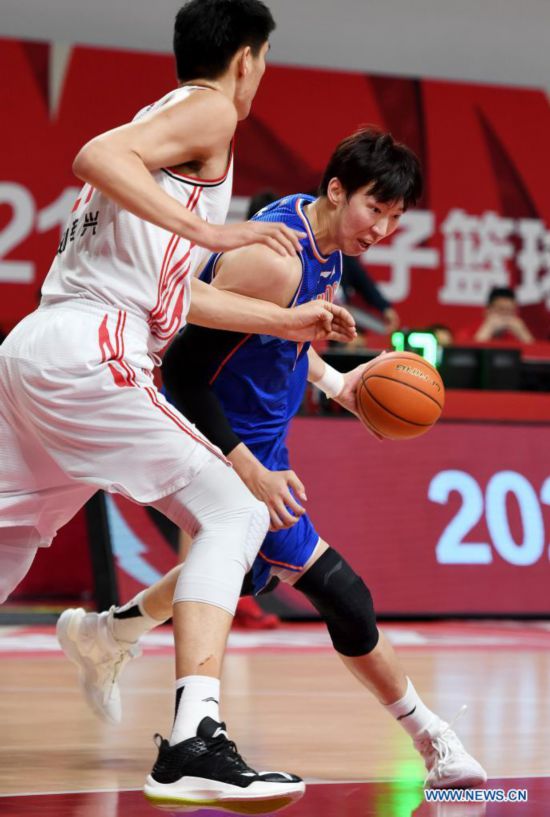 Zhou Qi (R) of Xinjiang Flying Tigers breaks through during the 53rd round match between Qingdao Eagles and Xinjiang Flying Tigers at the 2020-2021 season of the Chinese Basketball Association (CBA) league in Zhuji, east China's Zhejiang Province, April 6, 2021. (Xinhua/Li Ziheng)
