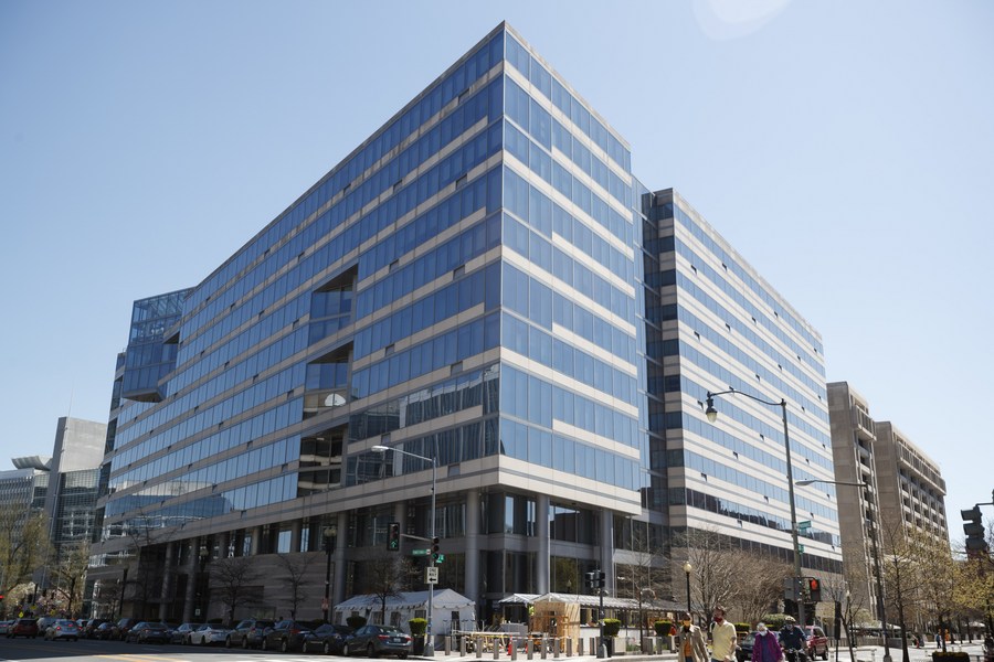 Photo taken on March 30, 2021 shows an exterior view of the International Monetary Fund (IMF) headquarters in Washington, D.C., the United States. (Photo by Ting Shen/Xinhua)