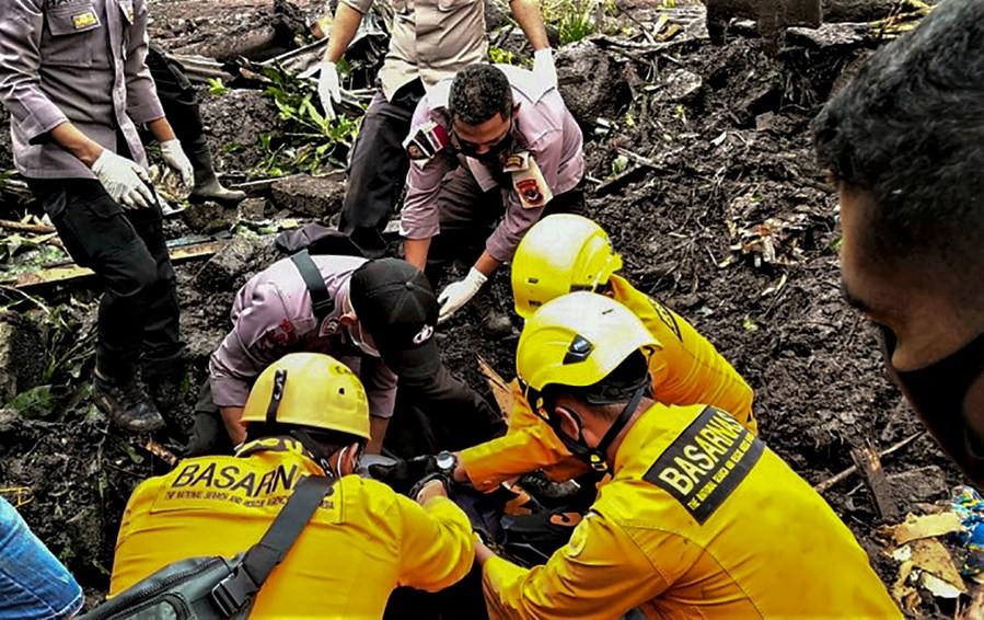 Members of Search and Rescue (SAR) team evacuate a victim of flash floods and landslides in Flores Timur district, East Nusa Tenggara, Indonesia.(Basarnas in Maumere/Handout via Xinhua)