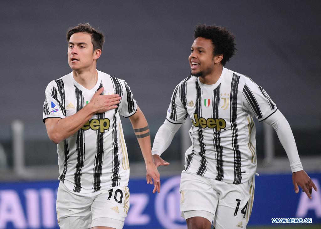 FC Juventus' Paulo Dybala (L) celebrates his goal with Weston Mckennie during a serie A football match between FC Juventus and Napoli in Turin, Italy, April 7, 2021. (Photo by Federico Tardito/Xinhua)