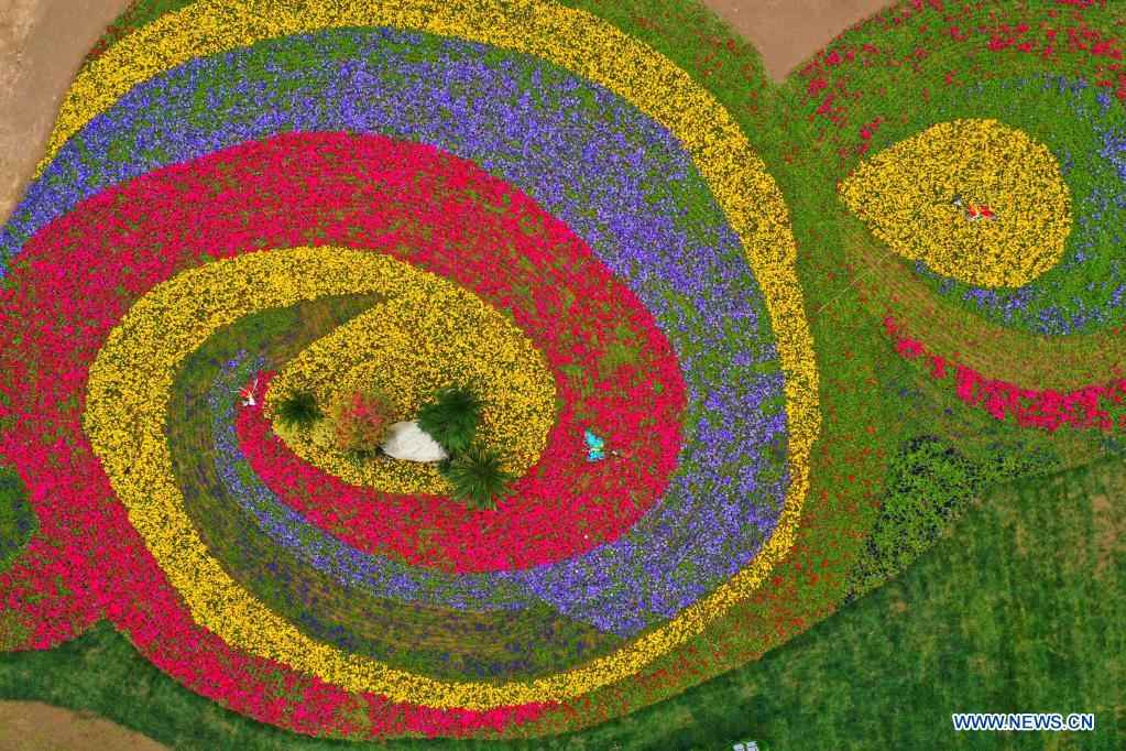 Aerial photo taken on April 7, 2021 shows flower fields in Xianyang Lake scenic area in Xianyang, northwest China's Shaanxi Province. (Photo by Li Junchao/Xinhua)