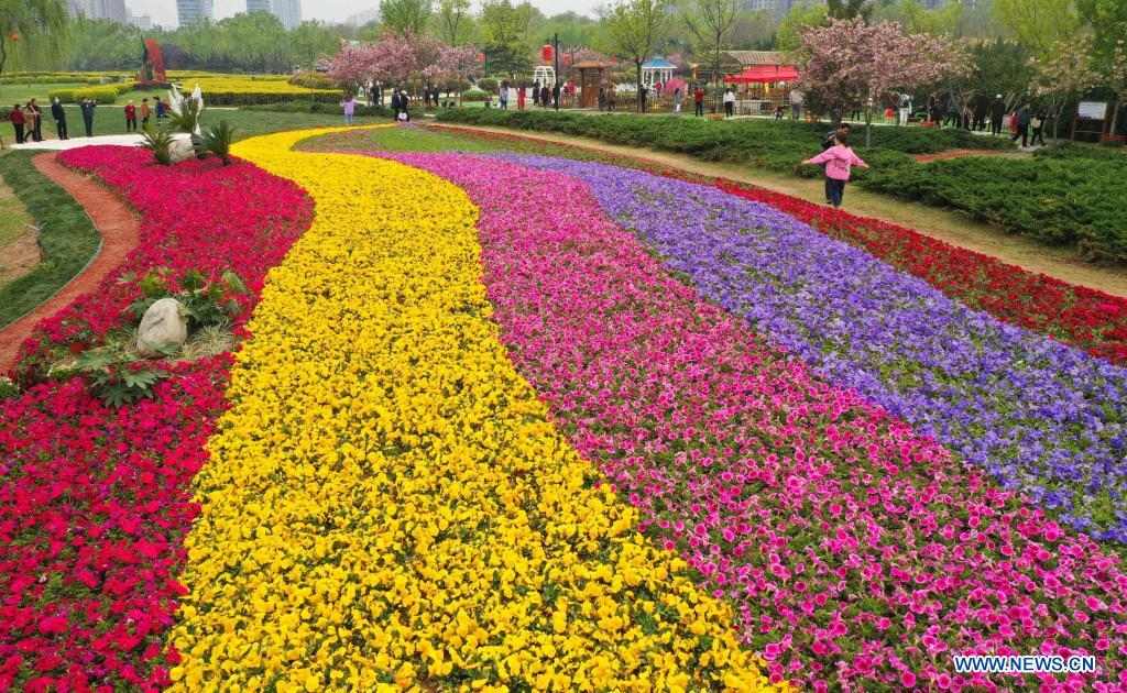 Tourists enjoy flowers in Xianyang Lake scenic area in Xianyang, northwest China's Shaanxi Province, April 7, 2021. (Photo by Li Junchao/Xinhua)