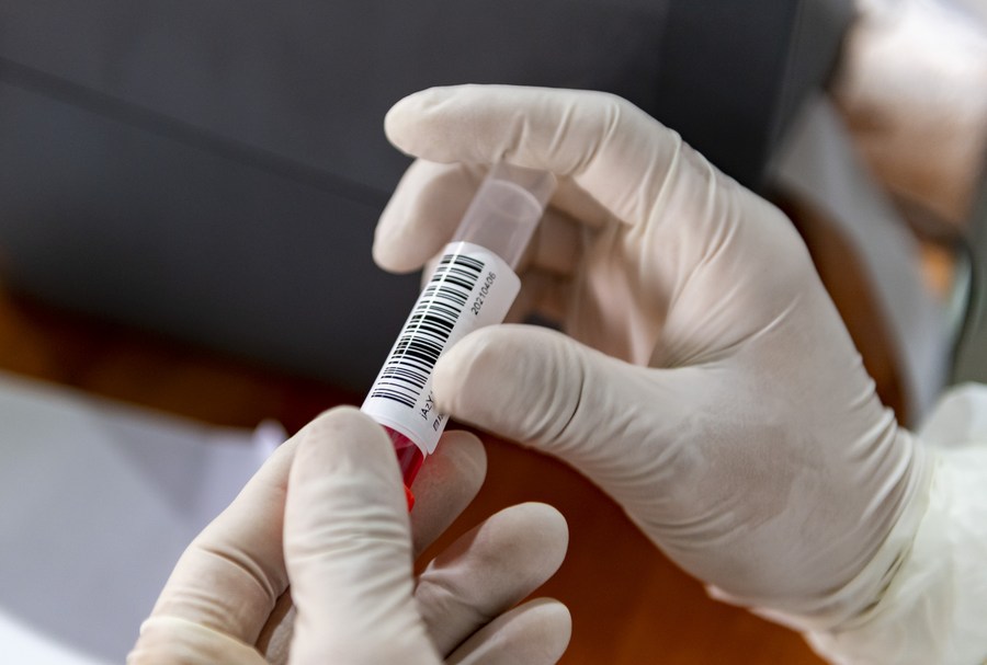 A medical worker attaches a bar code tag to a sample tube used in nucleic acid testing for COVID-19 at Munao community, Ruili City, southwest China's Yunnan Province, April 6, 2021.(Xinhua/Chen Xinbo)