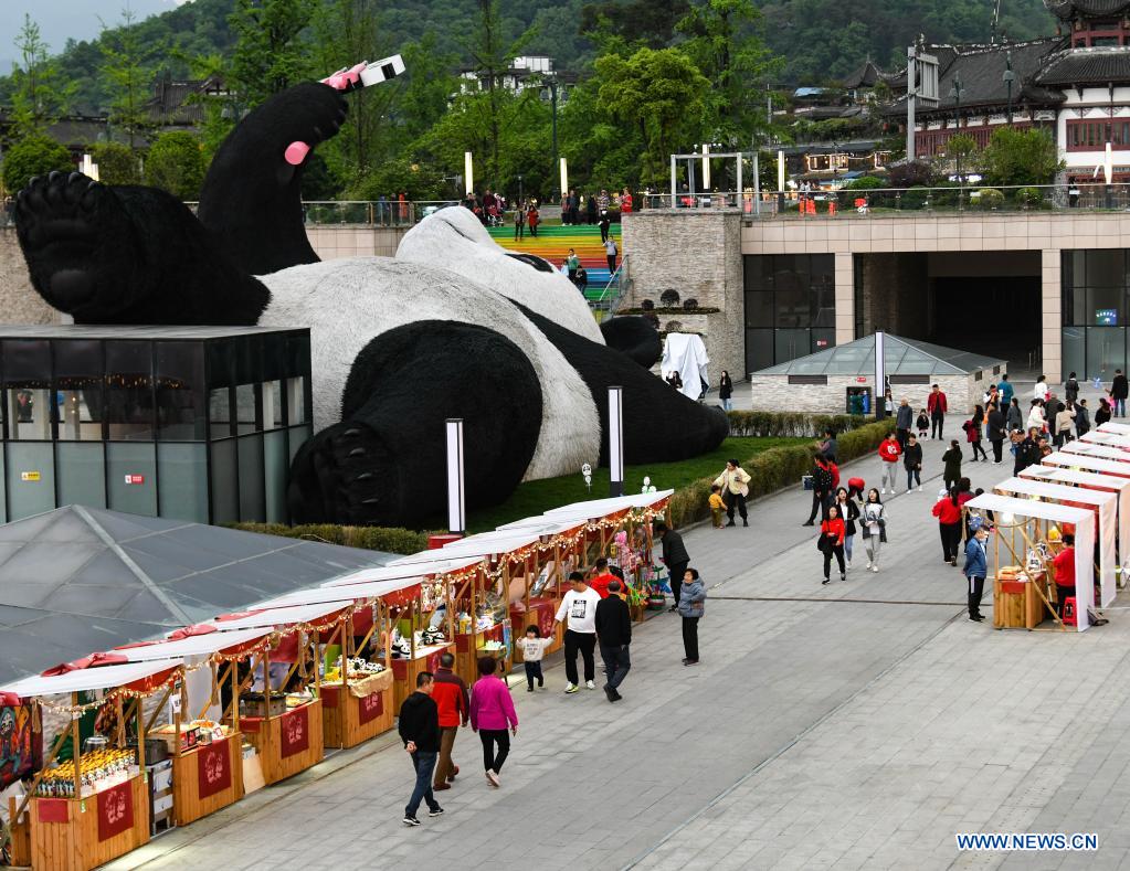 Tourists visit a creative market next to the "Selfie Panda" sculpture at Yangtianwo square in Dujiangyan, southwest China's Sichuan Province, April 7, 2021. A creation of Dutch artist Florentijn Hofman, the sculpture is 26.5m by 11m by 12m in dimension, featuring a selfie-taking giant panda lying on its back. Weighing 130 tonnes, the work takes shape with the help of three million lacquer-painted stainless steel rods. "Selfie Panda" is inspired by a real giant panda that went astray in downtown Dujiangyan in 2005. It soon became a popular photogenic spot following its recent public debut. (Xinhua/Wang Xi)