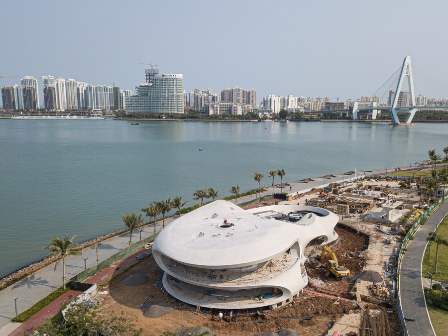 Aerial photo taken on Feb. 26, 2021 shows the construction site of the Wormhole Library in the Haikou Bay in Haikou, capital city of south China's Hainan Province. The Wormhole Library is designed as a landmark in the public life in the Haikou Bay. (Xinhua/Pu Xiaoxu)