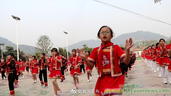 Recently, in the playground of Mengxian Primary School, Ning’er Hani and Yi Autonomous County, Pu’er City, more than 600 students dressed in Hani ethnic clothing did exercises between classes in the rhythm of the “cheamiche, chechegedie; diediegemo, momogexie”.