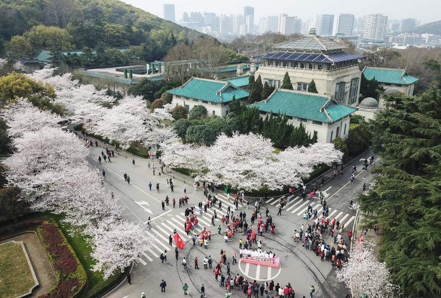 Medical workers who had assisted with the fight against the epidemic in 2020 enjoy the cherry blossom season at Wuhan University in central China's Hubei Province, March 13, 2021. (Xinhua/Cheng Min)