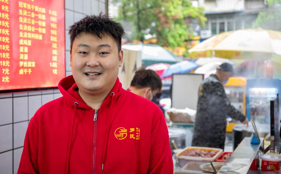 Photo taken on April 2, 2021 shows Luo Sisi at his hot dry noodles shop in Wuhan, central China's Hubei Province. (Xinhua/Rao Rao)