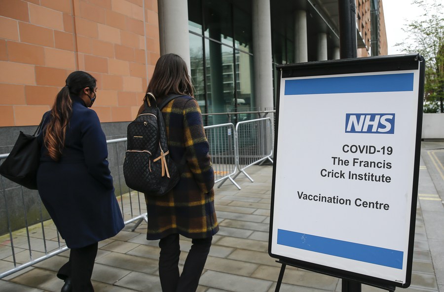 People walk past the Francis Crick Institute Vaccination Centre in London, Britain on March 18, 2021. (Xinhua/Han Yan)