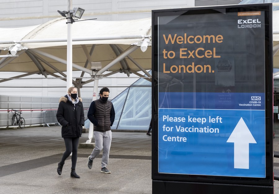 People wearing face masks walk past the Vaccination Centre at ExCel exhibition centre in London, Britain, Jan. 12, 2021. (Xinhua/Han Yan)