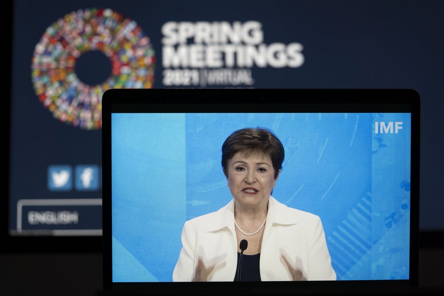 Photo taken in Arlington, Virginia, the United States, on April 7, 2021 shows a screen displaying International Monetary Fund (IMF) Managing Director Kristalina Georgieva speaking at a virtual press conference during the IMF/World Bank Spring Meetings. (Xinhua/Liu Jie)