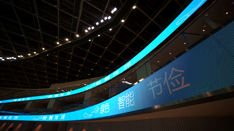 Eye-catching Chinese characters displayed in the venue for the 19th Asian Games, to be held in September 2022 in Hangzhou, capital of east China’s Zhejiang province, show the organizer’s concept of prioritizing green, intelligence, frugality and civilization throughout the preparations for and holding of the Asian Games. (Photo/Jin Zhongyao)