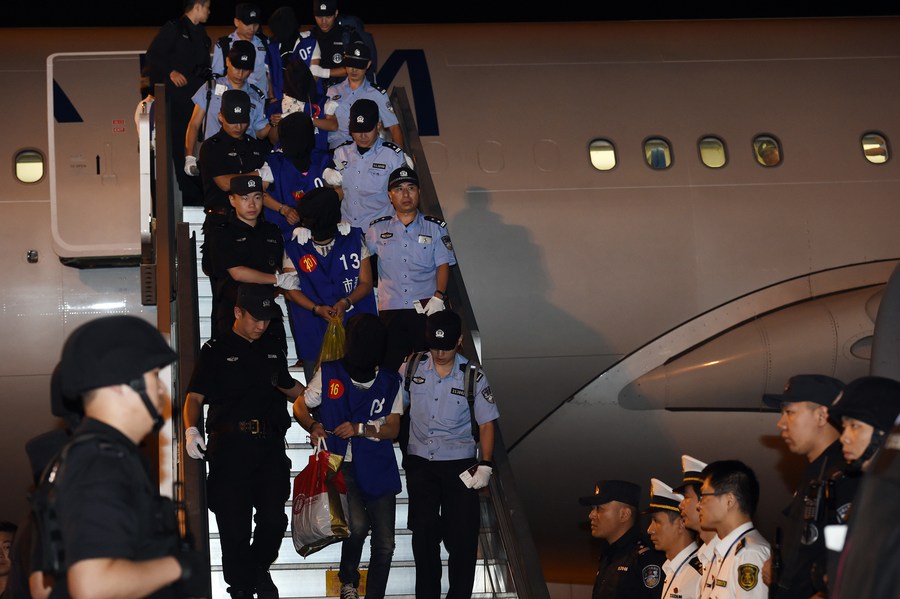 File photo show Chinese telecom fraud suspects are escorted off an aircraft by the police at Lukou International Airport in Nanjing, capital of east China's Jiangsu Province. (Xinhua/Han Yuqing)