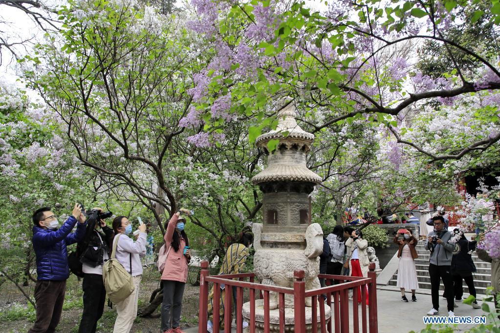 Visitors take pictures of blooming lilacs at Fayuan Temple in Beijing, capital of China, April 11, 2021. (Photo by Liu Xianguo/Xinhua)