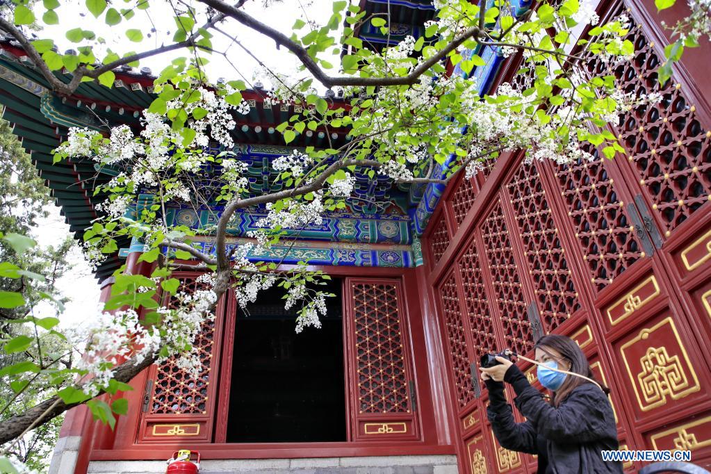 A visitor takes pictures of blooming lilacs at Fayuan Temple in Beijing, capital of China, April 11, 2021. (Photo by Liu Xianguo/Xinhua)