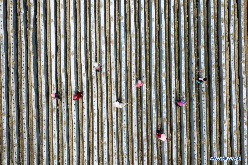 Aerial photo shows farmers working in the field in Shangzhuang Village, Zaozhuang City, east China's Shandong Province, April 10, 2021. (Photo by Li Zhijun/Xinhua)