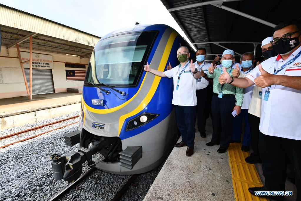 Malaysian Transport Minister Wee Ka Siong (L) poses for photos with the Diesel Multiple Unit train in Kota Bharu, the capital of Malaysia's northern Kelantan state, April 11, 2021. The Diesel Multiple Unit (DMU) trains manufactured by China Railway Rolling Stock Corporation (CRRC) Zhuzhou Electric Locomotive Co., Ltd were launched into operations on Sunday, which will boost connectivity and facilitate travel in Malaysia's eastern coast area. (Xinhua/Zhu Wei)