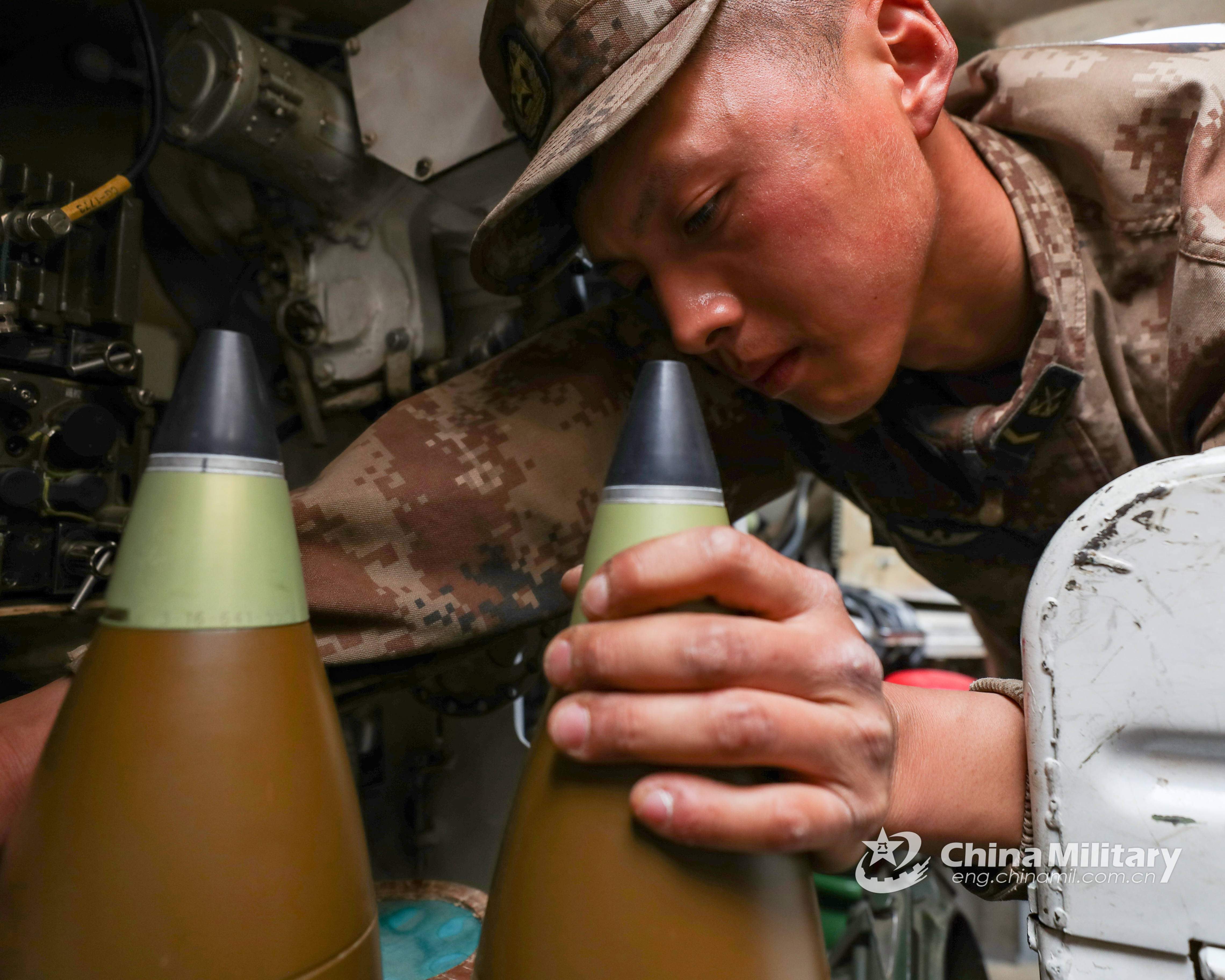 An artilleryman assigned to a combined arms brigade under the PLA 72nd Group Army loads ammunitions onto a tank during a live-fire training exercise from March 26 to 29, 2021. (eng.chinamil.com.cn/Photo by Zhang Wenju)