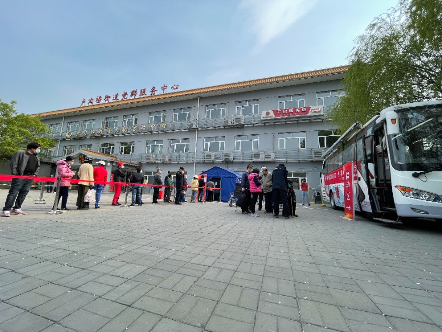 Residents stand in line to get vaccinated in front of a vaccination vehicle in Fengtai District, Beijing, capital of China, April 10, 2021. (Xinhua/Tian Chenxu)