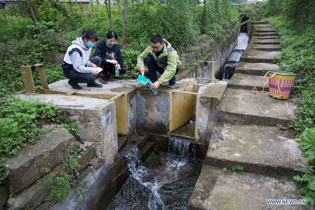 Researchers collect water samples at a sampling point in Zhongxian County, southwest China's Chongqing, April 11, 2021. The Three Gorges project is a vast multi-functional water-control system on the Yangtze River, China's longest waterway, with a 2,309-meter-long and 185-meter-high dam. The water levels of the reservoir area inevitably fluctuate on an annual discharge-storage cycle between 145m to 175m at the dam. The water level fluctuation zone also encounters some eco-environmental problems, including soil erosion and non-point source pollution. Researchers of the Institute of Mountain Hazards and Environment, Chinese Academy of Sciences (CAS) have conducted comprehensive investigations on soil, plants, hydrology, water quality and sediment in the area. Their study has important implications on better running the function of the Three Gorges Reservoir and the safety of local ecological environment. (Xinhua/Jin Liwang)