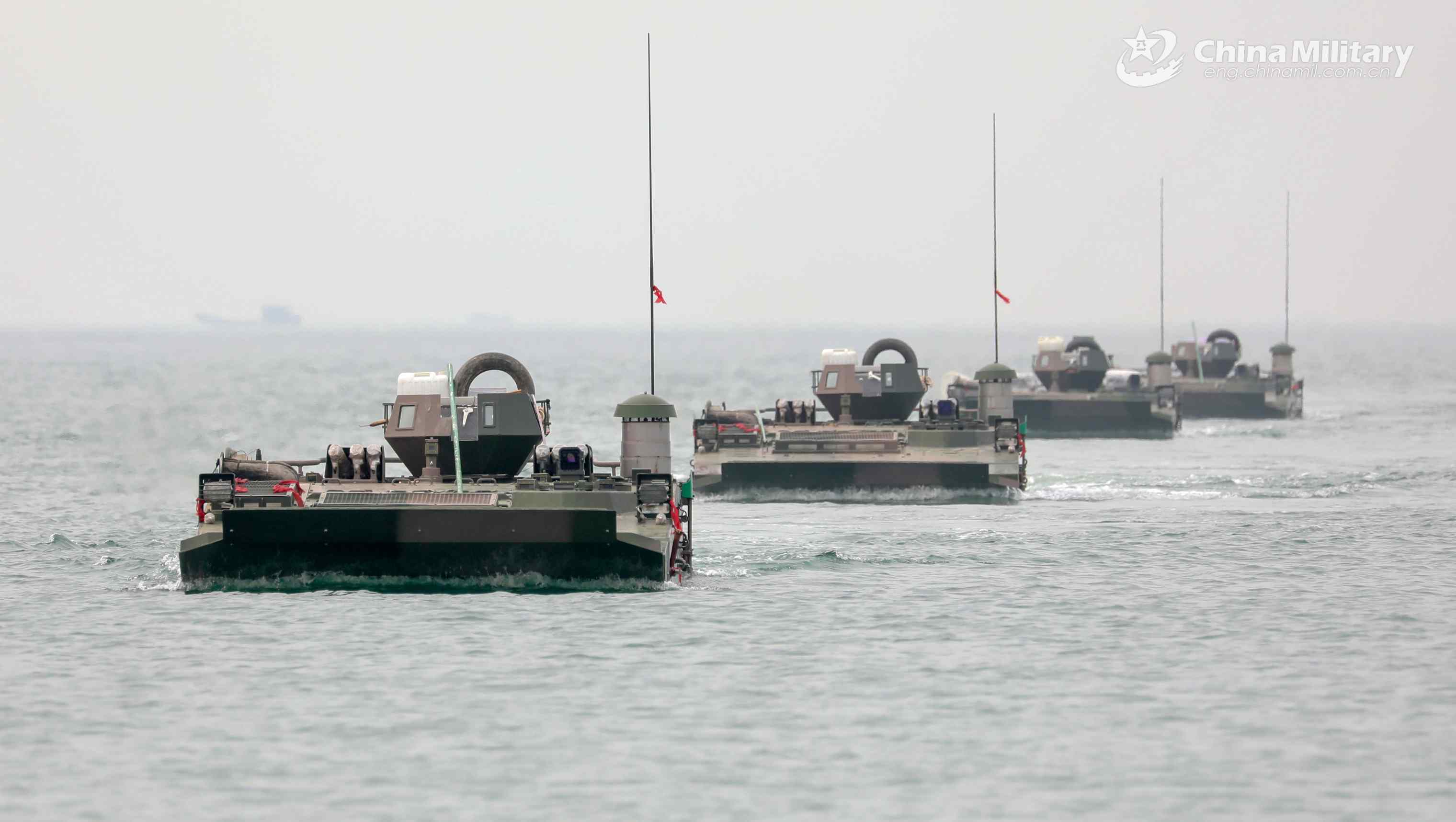 Amphibious armored vehicles attached to a brigade of the PLA 73rd Group Army march forward in the water during a maritime driving drill on March 29, 2021. (eng.chinamil.com.cn/Photo by Wang Lei)