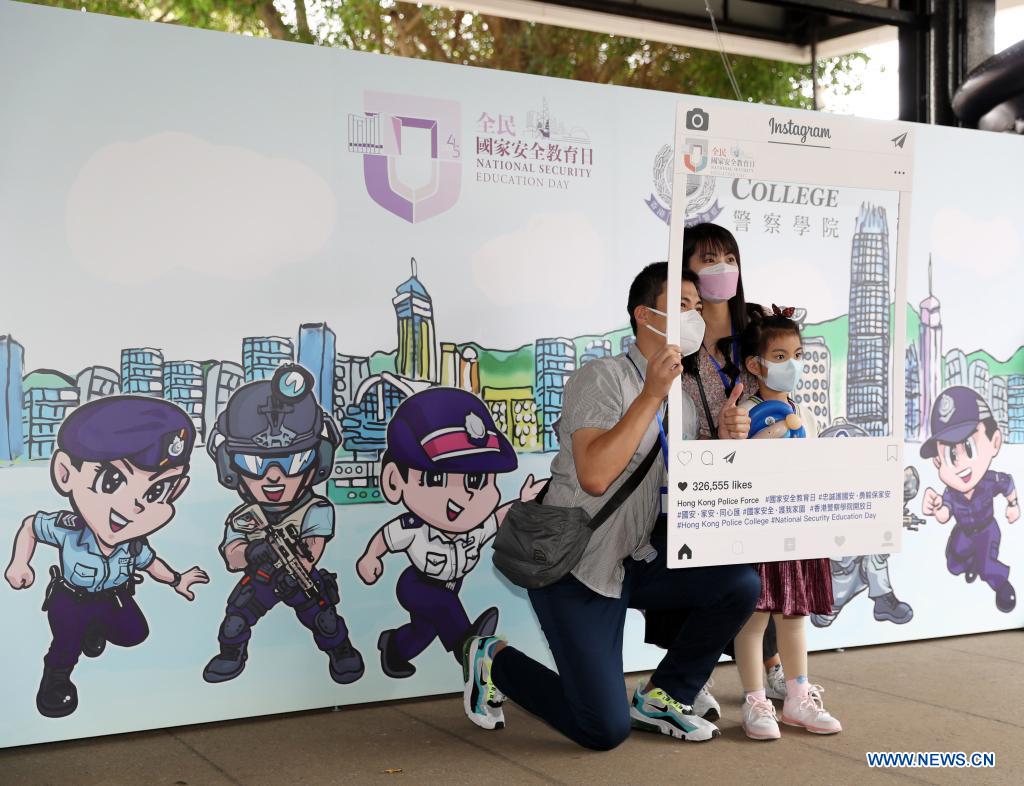 Citizens pose for a photo during an activity themed on National Security Education Day at the Hong Kong Police College in south China's Hong Kong, on April 15, 2021. Hong Kong on Thursday embraced its first National Security Education Day after the law on safeguarding national security in the Hong Kong Special Administrative Region (HKSAR) came into force in mid-2020. Various activities, including lectures, exhibitions, mosaic walls and doors open days of disciplined services, were held to boost the public awareness of safeguarding national security in the global financial hub. (Xinhua/Li Gang)