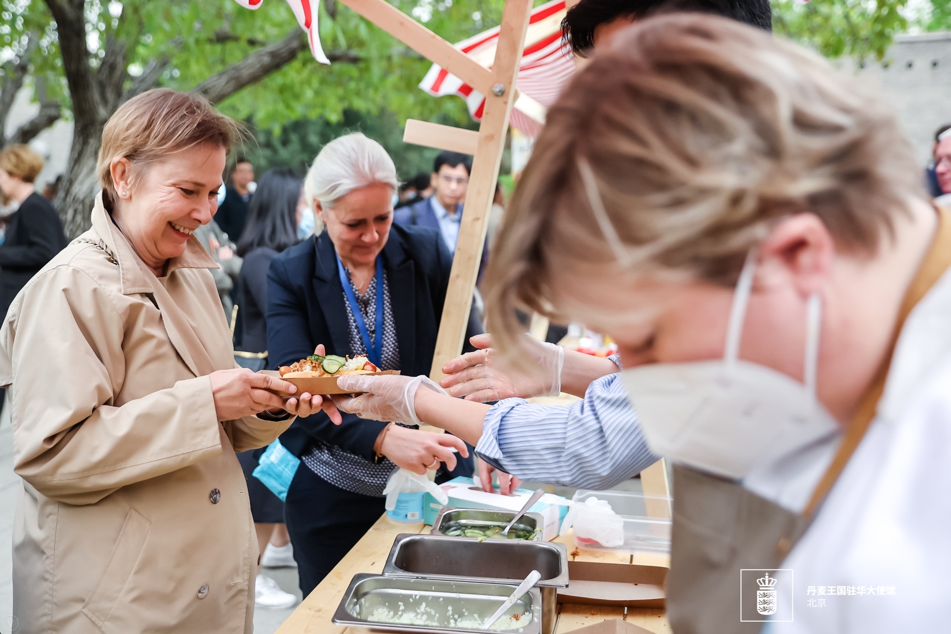 Photo taken on April 15 shows guests queuing up for freshly made hotdogs at the Embassy of the Kingdom of Denmark in Beijing, where a 100-year birthday party for Danish hotdog stands was held. (Photo/Courtesy of the Embassy of the Kingdom of Denmark)