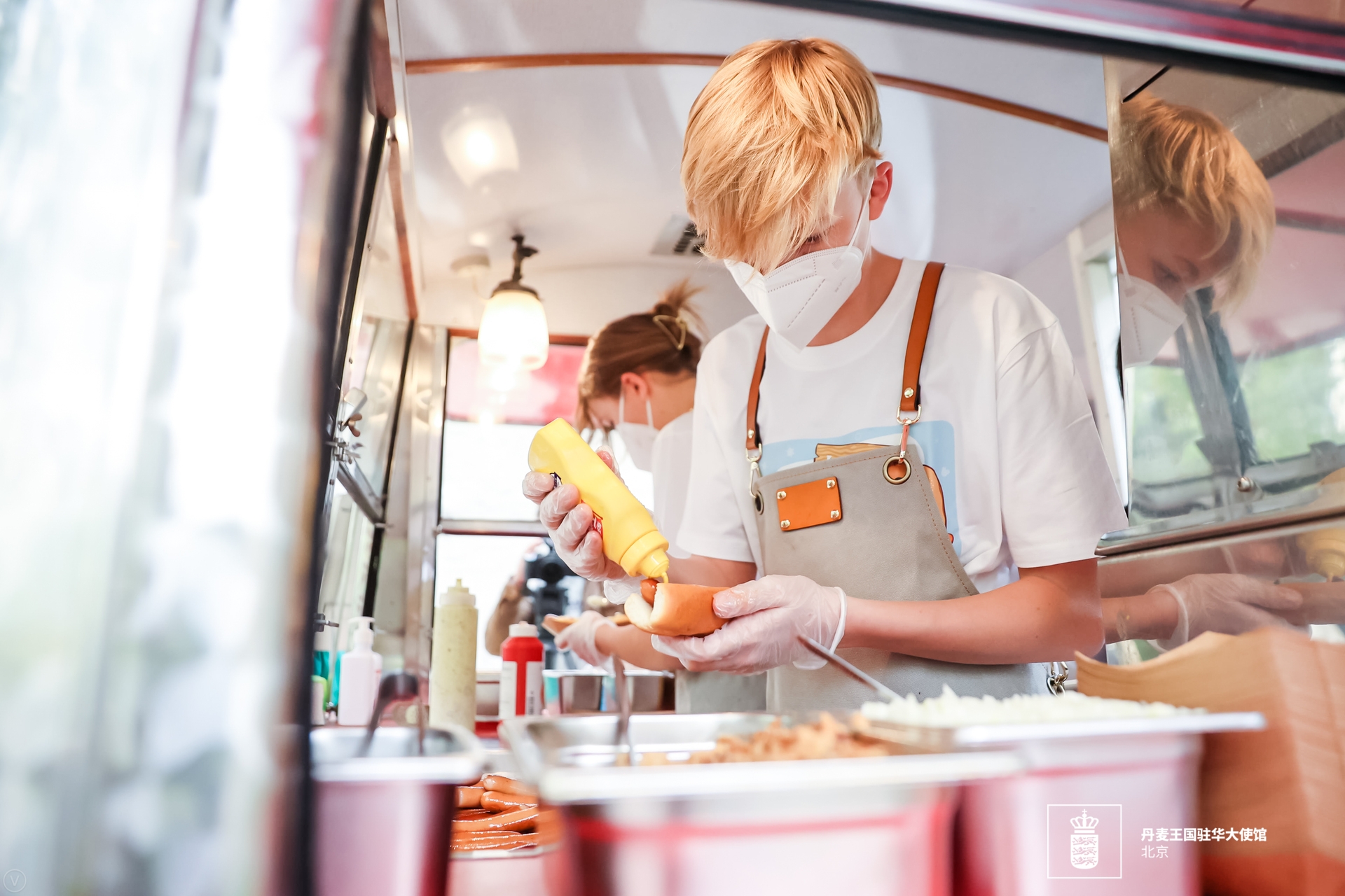 Photo taken on April 15 shows the making of hotdogs inside a P?lsevogn at the Embassy of the Kingdom of Denmark in Beijing. (Photo/Courtesy of the Embassy of the Kingdom of Denmark)