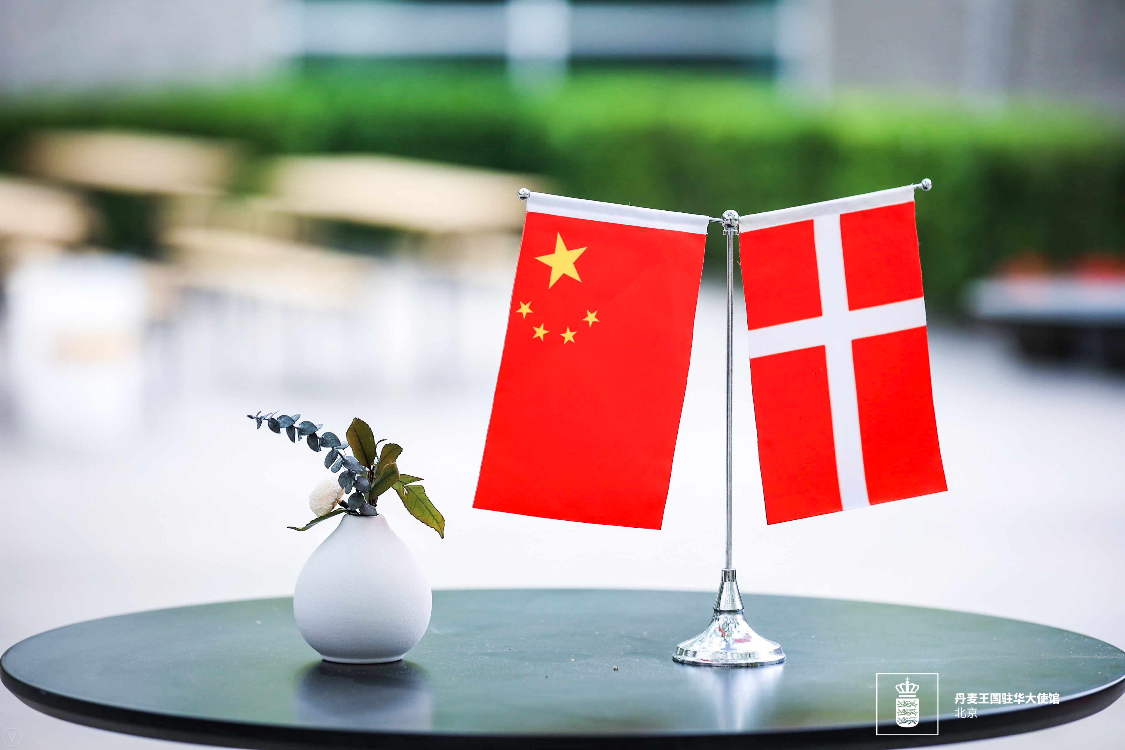 Photo taken on April 15 shows Chinese and Danish flags displayed at the 100-year birthday party for Danish P?lsevogn (hotdog stands) at the Embassy of Denmark in Beijing. (Photo/Courtesy of the Embassy of the Kingdom of Denmark)