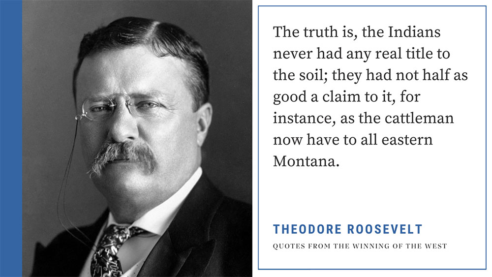 Theodore Roosevelt was even more aggressive when it came to the treatment of Native Americans, having claimed in his book The Winning of the West that “the truth is, the Indians never had any real title to the soil.”