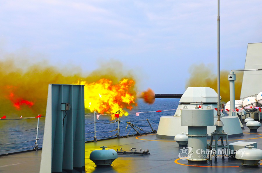 Warship attached to a naval landing ship flotilla under the PLA Southern Theater Command fires its auxiliary gun at mock sea targets during a maritime training exercise on March 27, 2021. (eng.chinamil.com.cn/Photo by QiaoChenxi)