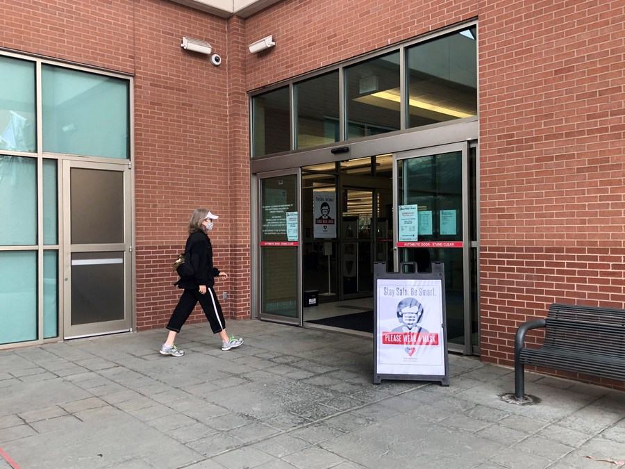 A lady with face mask walks into a public library with a notice of mandatory mask requirement outside in Plano, a northern suburban city of Dallas, Texas, the United States on March 10, 2021. (Photo by Dan Tian/Xinhua)