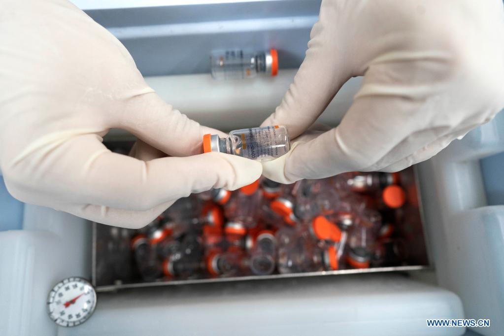 A medical worker holds a Sinovac COVID-19 vaccine at a vaccination center in Ecatepec, Mexico, on April 16, 2021. Chinese vaccines have been part of health cooperation that Mexico and China have been maintaining since last year to tackle COVID-19. (Xinhua/David de la Paz)