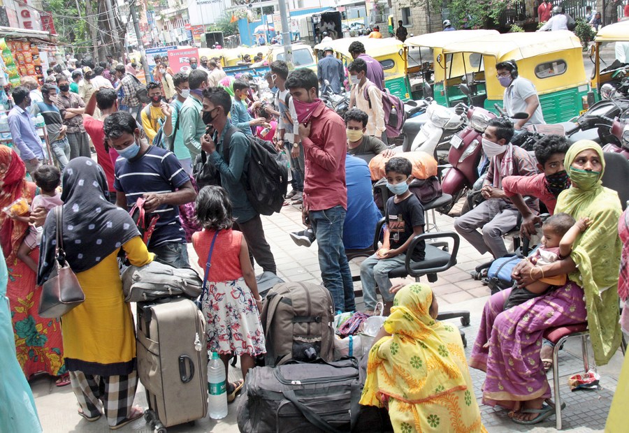 Indian migrant workers and their families are seen outside the bus transport booking center during the coronavirus pandemic, in Bangalore, India, April, 15, 2021. India's COVID-19 surge continued as a fresh high of 200,739 new cases were registered on the day.(Str/Xinhua)
