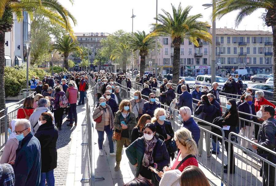 People line up to receive the COVID-19 vaccine at a vaccination center in Nice, southern France, April 10, 2021. (Photo by Serge Haouzi/Xinhua)