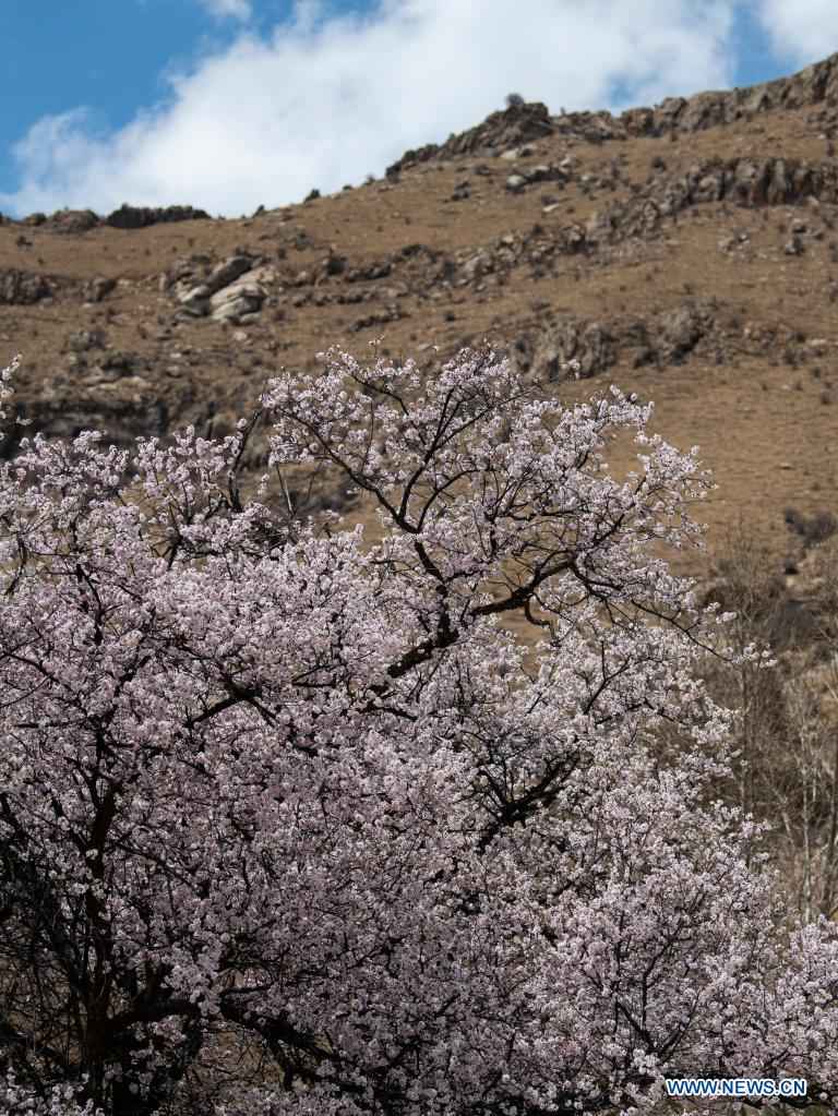 Peach blossoms are seen near the Pabonka Hermitage in the northern suburb of Lhasa, southwest China's Tibet Autonomous Region, April 18, 2021. (Xinhua/Chogo)