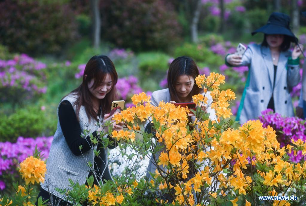 Tourists visit an azalea planting base in Erjieling Village of Sian Town, east China's Zhejiang Province, April 20, 2021. Flowers in planting bases are in full bloom as temperature rises recently in Changxing, attracting tourists and boosting local economic development. (Xinhua/Xu Yu)
