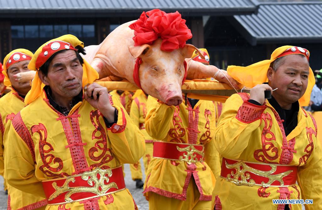 Photo taken on April 20, 2021 shows the view of a grand ritual to pay homage to Cangjie, the legendary creator of Chinese characters, in Luonan County of Shaanxi Province. Tuesday marks Guyu, literally meaning "grain rain", which is the 6th of the 24 solar terms created by ancient Chinese to carry out agricultural activities. People pay homage to Cangjie because legend has it that he succeeded in creating Chinese characters on the day of Guyu thousands of years ago. (Xinhua/Liu Xiao)