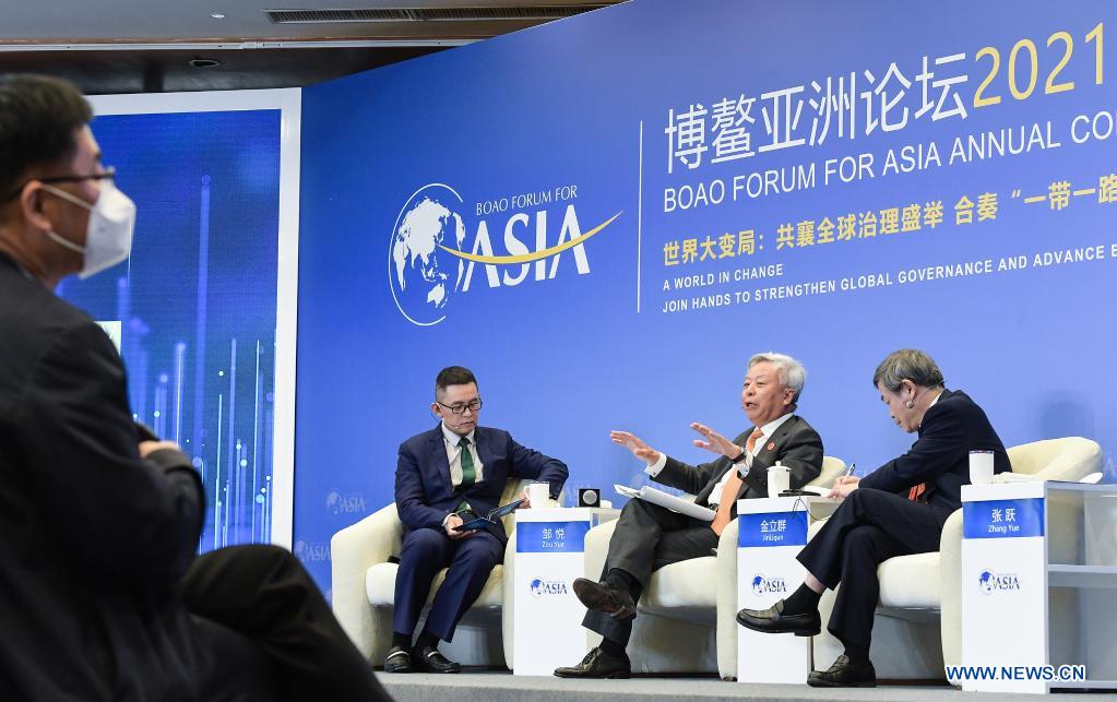 President of the Asian Infrastructure Investment Bank Jin Liqun (2nd, R) speaks at the sub-forum themed "path to carbon neutrality" during the Boao Forum for Asia annual conference in Boao, south China's Hainan Province, April 20, 2021. (Xinhua/Li He)