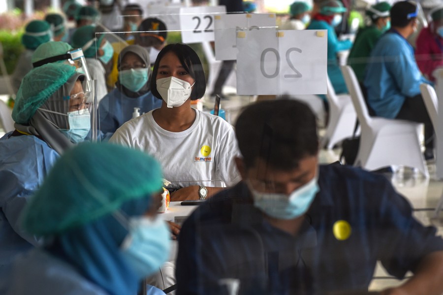 Health workers wait for registration before receiving doses of China's Sinovac COVID-19 vaccine during mass vaccination program for health workers as a main priority group in Jakarta, Indonesia, Feb. 4, 2021. (Xinhua/Agung Kuncahya B.)