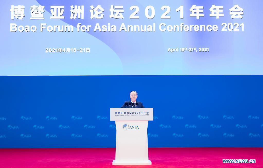 Chinese Vice President Wang Qishan attends the Boao Forum for Asia (BFA) Annual Conference 2021 opening ceremony in Boao, south China's Hainan Province, April 20, 2021. Wang met with members of the BFA board of directors and the forum's strategic partners, and exchanged views with representatives from the business circle. (Xinhua/Li Tao)