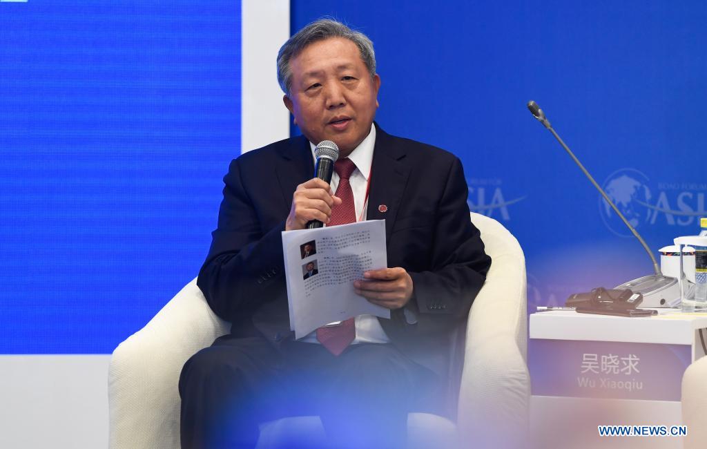 Wu Xiaoqiu, Vice Chairman of Academic Committee of Renmin University of China and Dean of China Capital Market Research Institute, hosts a sub-forum themed "Dual Circulation - China's New Growth Paradigm" during Boao Forum for Asia (BFA) annual conference in Boao, south China's Hainan Province, April 21, 2021. A sub-forum themed "Dual Circulation - China's New Growth Paradigm" was held in Boao on Wednesday. (Xinhua/Yang Guanyu)