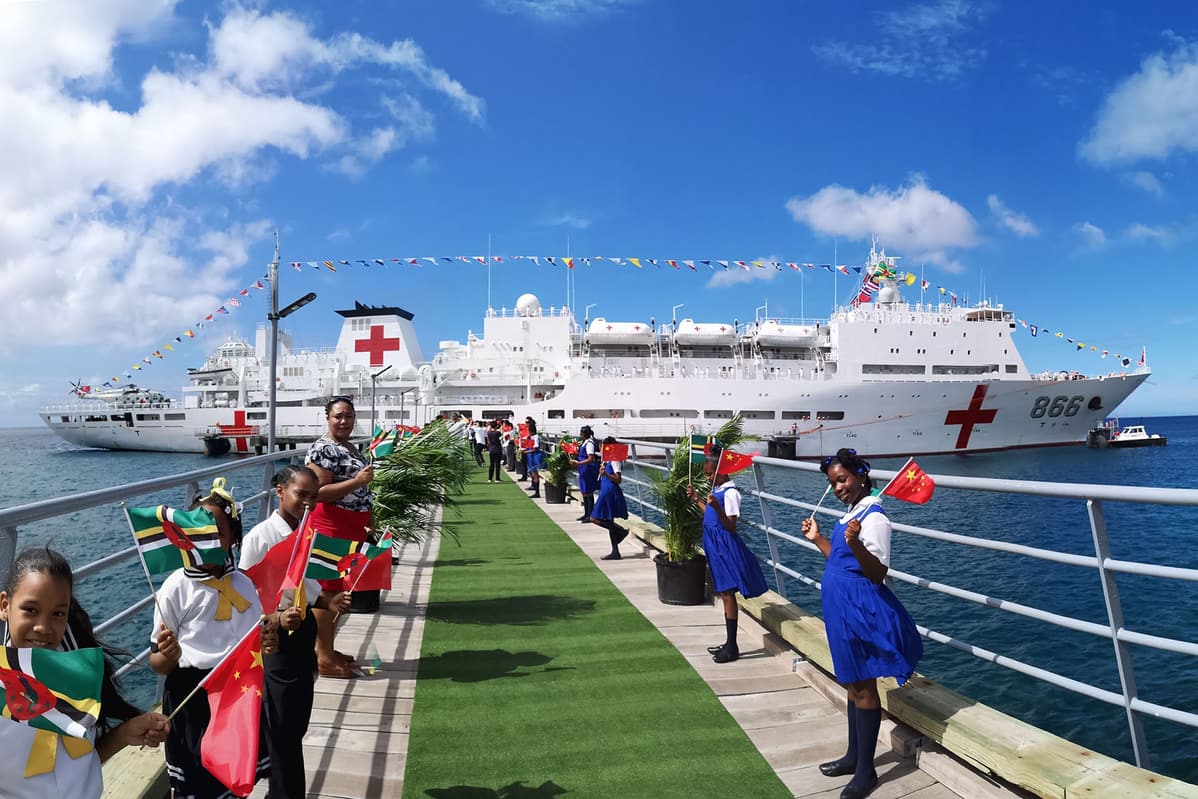 Students turn out to welcome the first visit by the Chinese Navy hospital ship Peace Ark at the Port of Roseau, Dominica, in October 2018. [Photo by Jiang Shan/For China Daily]