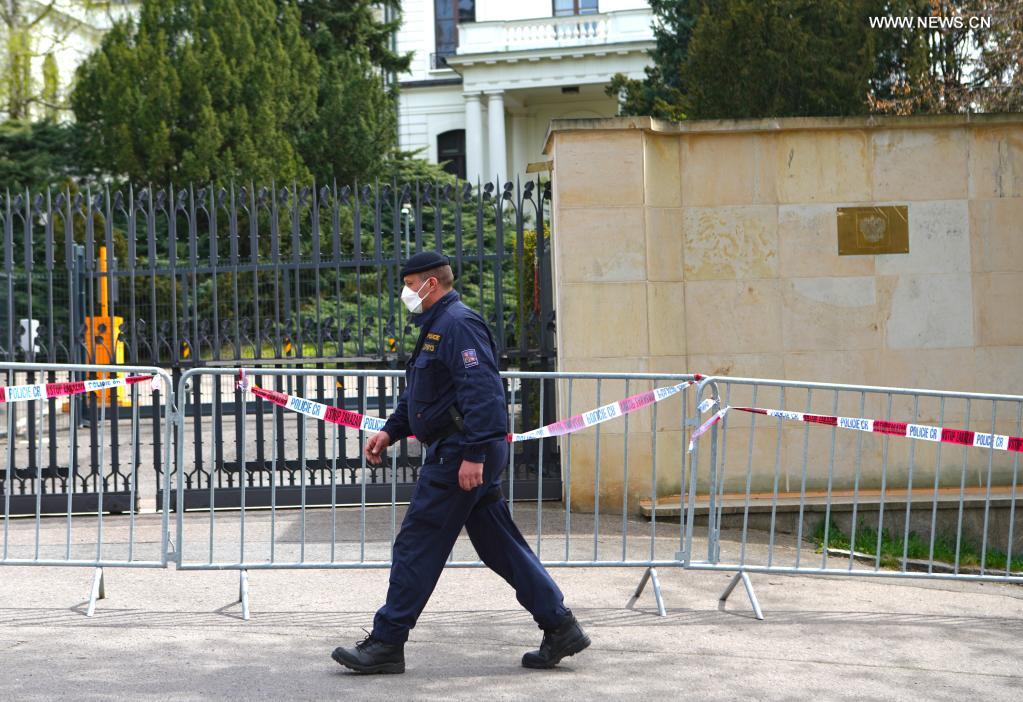 A Czech policeman is seen outside the Russian embassy in Prague, the Czech Republic, on April 22, 2021. The Czech Republic will reduce and put a cap on the number of employees in the Russian embassy in Prague to the same number at the Czech embassy in Moscow, the Czech Foreign Ministry said on Thursday. (Photo by Dana Kesnerova/Xinhua)